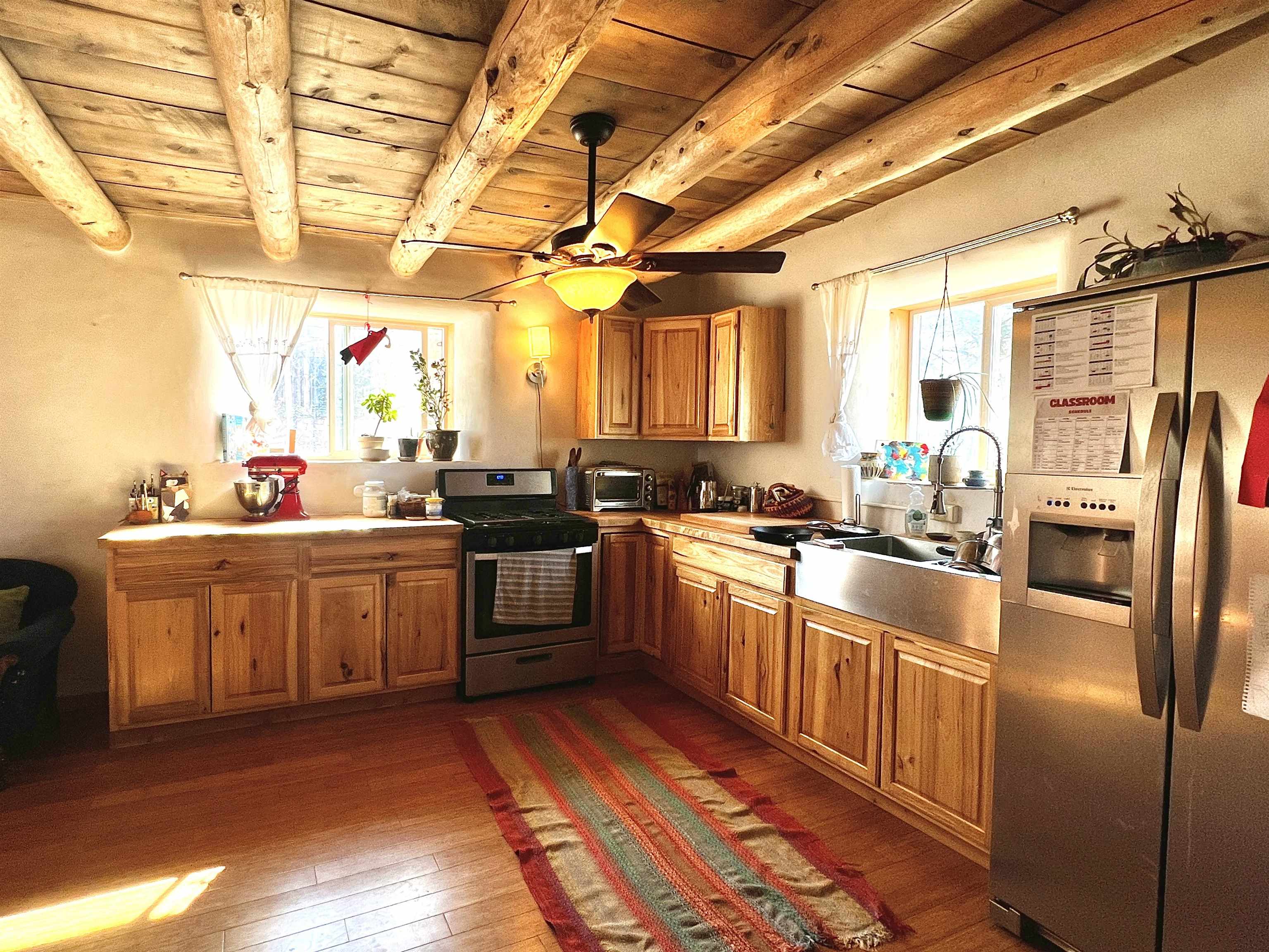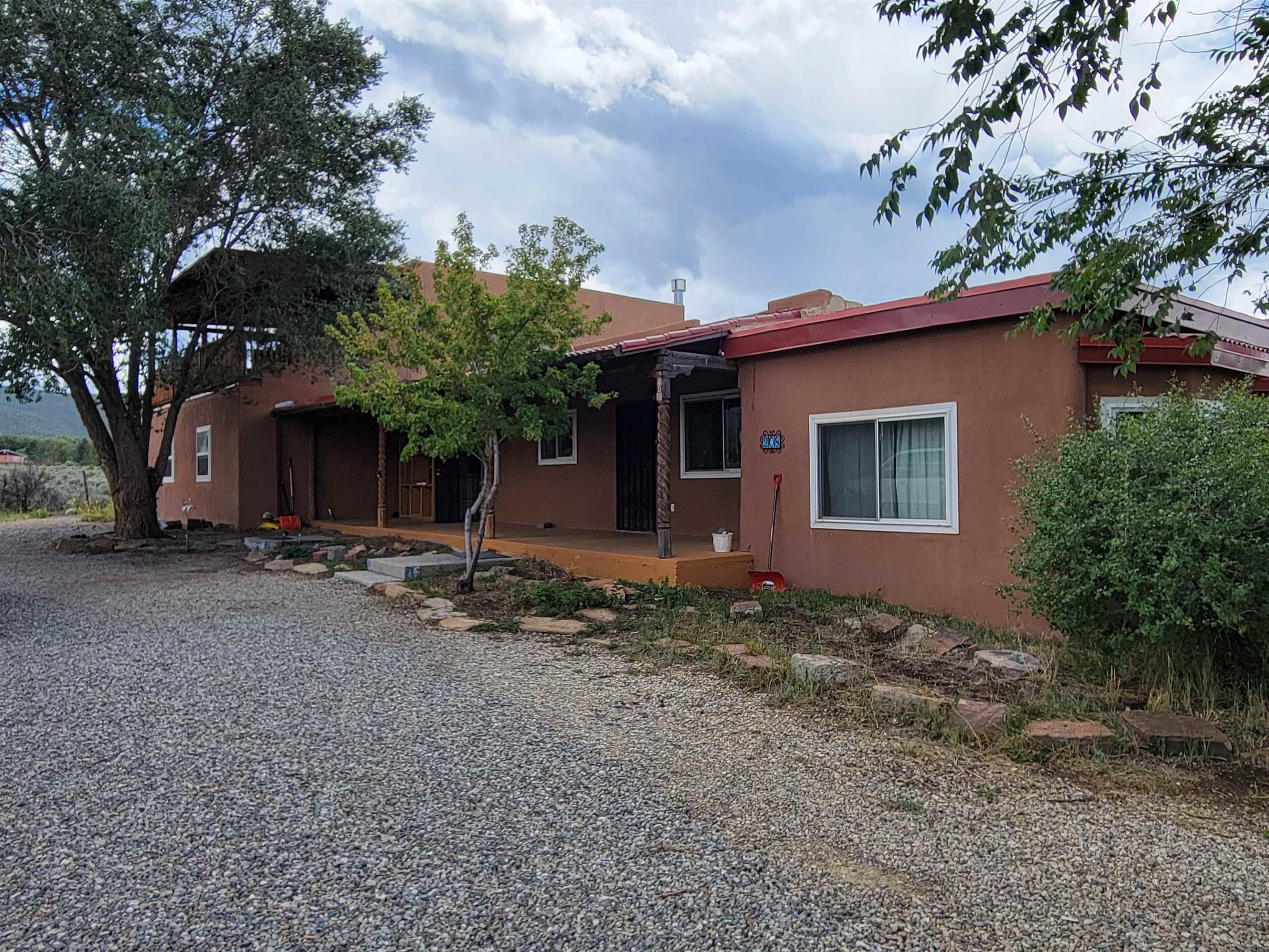 This completely renovated home in the heart of Taos is not to be missed! It is perfectly located within walking distance to Taos Plaza and shops, yet nestled peacefully in the trees. Las Cruces Road is tucked into a sweet, quiet neighborhood, just off Kit Carson Road. A generous front deck greets you upon arrival to this home. Beautiful, carved beams and adobe accents grace the exterior. Inside, you’ll find thoughtful contemporary stylings throughout. This two bedroom, two full bathroom home was entirely, recently renovated. It features all new plumbing and electrical, high end stainless steel appliances, and custom, artful tile work throughout the home. A large, open concept living area expands into a spacious kitchen. Granite countertops, a large center island, double oven, and sophisticated lighting make this kitchen a chef’s dream. One of a kind tile work is featured on the backsplash, a truly artistic cooking environment. Large windows and skylights let plenty of light in, offering views of the treetops. On the same level is a laundry room with plenty of storage, and a full bathroom. The exquisite tile work echos through the shower and tub, as well as the vanity and mirror. A beautiful staircase leading downstairs features stainless steel railings and more artful tile risers. There are two bedrooms and one full bathroom downstairs. The bathroom features a gorgeous glass and tile shower. The large master bedroom boasts a large walk in closet, and French doors that open into a tree filled backyard and a private patio. The spacious yard, set on .25 acres, homes gorgeous shade trees. Listen to the wind and birds as the rest of the world melts away. Stone paver walkways around the home, gardens, a stone wall, and a partially fenced yard enhance the outdoor space. There is an additional 96 square foot storage shed for your tools and toys. This is a beautifully renovated home, in an incredible location. Reach out to set up a private viewing today. Listed by of Coldwell Banker Mountain Properties - .