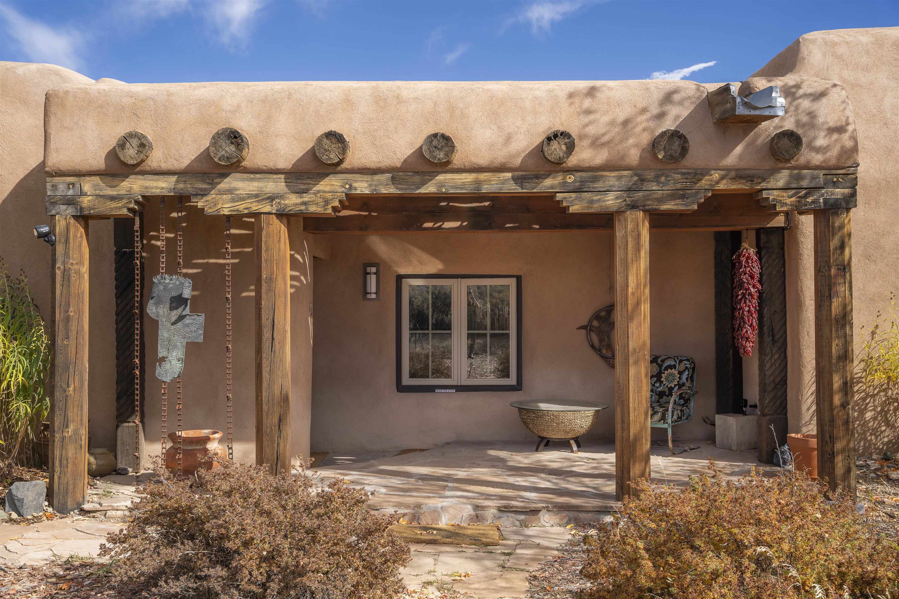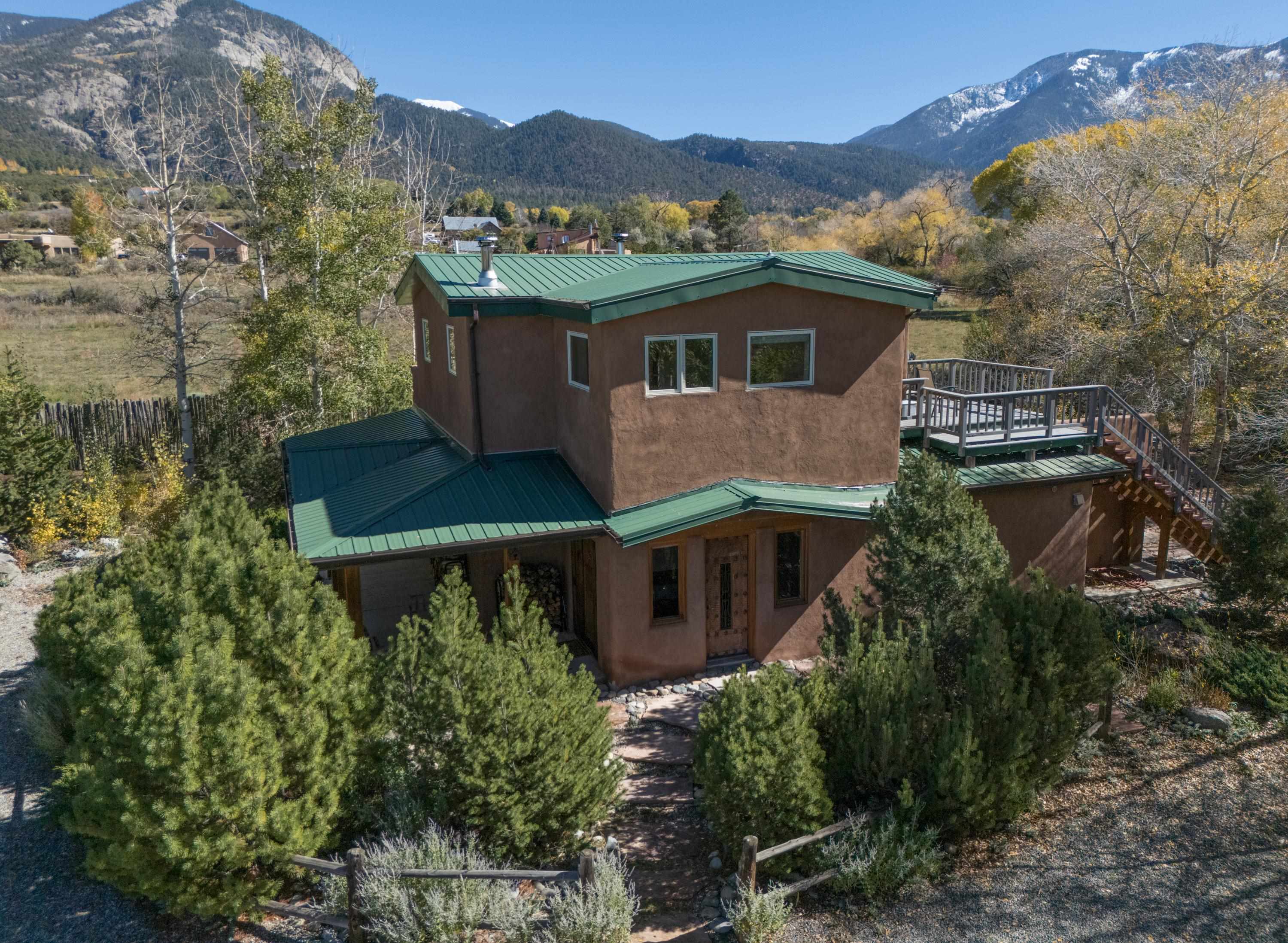 This adobe sanctuary forged by hand and earth is a testament to the power of nature and the artistry of life. A hand built adobe home of this quality is a rarity. Bursting with natural light this Taos treasure was built in the old style to capture the warmth and magic of the original adobe dwellings. Meticulously finished there is nothing like it on the market. Surrounded by alluring views of the Sangre de Cristo Mountains and skies that seem to go on forever. This hacienda truly tells a story. Traditional finishes include double thick adobe walls built by hand from the soil of the surrounding land. Selected interior walls have been lime-washed using time honored original techniques. Others are straw-infused, nichos, hand hewn vigas, aspen and cedar and exquisite sealed earthen floors that are both enduring and eco friendly. Each room has a kiva southwest style fireplace, and hand-carved doors. Several interior doors are 3” solid wood slabs that have to be seen and touched to capture their beauty. Diamond finished hand plaster accents the bathrooms with stone carved vessel sinks. This time-honored style is accented with modern upgrades including a contemporary kitchen, Hubbardton Forge lighting fixtures and custom Elfa closet shelving in the walk in cedar lined closets throughout. The gracious floor plan features the primary suite on the north end of the house that also features a secluded study with a sunburst viga ceiling. On the south side of the home there are two additional bedrooms separated by a large living area. The sleeping area in one of the rooms is truly magical. The spacious kitchen opens to a living area with a beautiful view of Taos Mountain creating an inviting gathering space. Delightful outdoor areas perfect for relaxation or socializing include a cover pergola, sail shades and pondless water feature. In addition there is a stunning separate casita and/or artist studio with plenty of light,10 ft ceilings and a wood burning stove. This fully equipped one bedroom casita with bath/shower, kitchen, induction range and laundry has been an active licensed part time rental. Adding income while maintaining complete privacy for both dwellings. It can also be used as a guest cottage for visitors or family member. Located near Taos Country Club, UNM Taos and hiking trails. Just 20 minutes to Town of Taos, 40 minutes to Taos Ski Valley, 60 minutes to Santa Fe. An artists haven that brings together the natural materials of the earth and the conveniences for todays living. A home that is true to the earth. Listed by of Berkshire Hathaway HomeServices Taos Real Estate - .